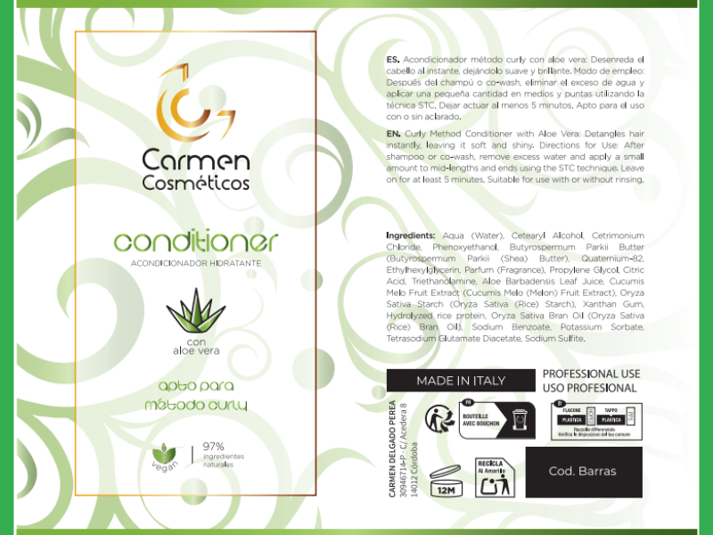 El Acondicionador Hidratante Vegano de Carmen Cosméticos 300ml es el aliado perfecto para el cuidado del cabello rizado y ondulado. Su fórmula ligera y nutritiva desenreda el cabello al instante, dejándolo suave, brillante y lleno de nutrición, sin apelmazarlo. Este acondicionador está especialmente diseñado para quienes siguen el Método Curly o buscan un producto vegano que respete su cabello y el medio ambiente.