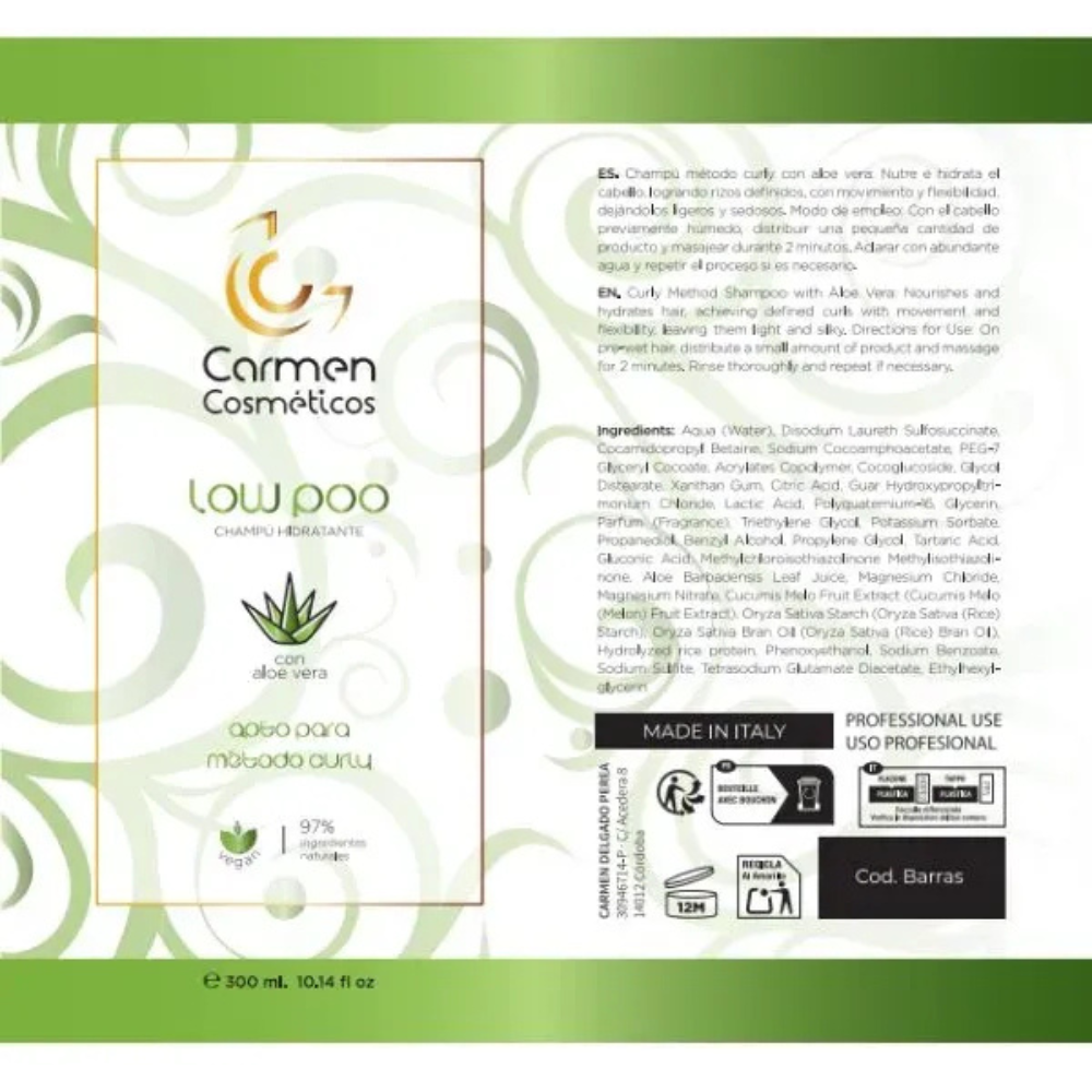 El Low Poo Champú Hidratante Vegano de Carmen Cosméticos es una opción ideal para quienes buscan una limpieza suave y efectiva sin sulfatos ni siliconas, respetando la estructura natural del cabello rizado. Su fórmula vegana está enriquecida con ingredientes naturales que nutren e hidratan profundamente, logrando rizos definidos, suaves y con movimiento.